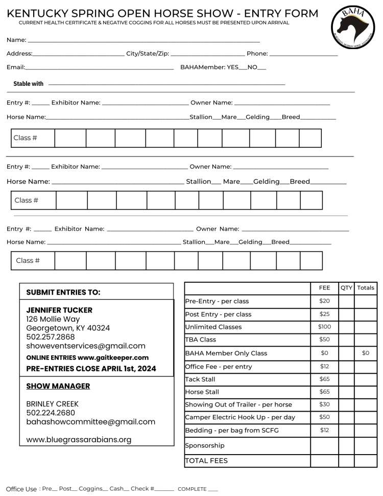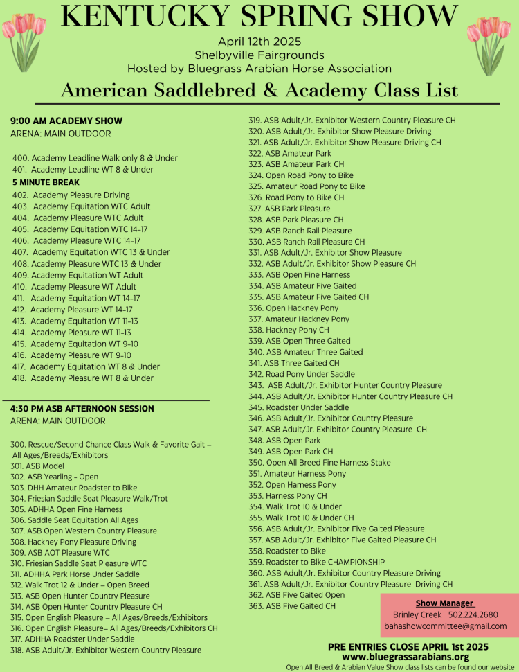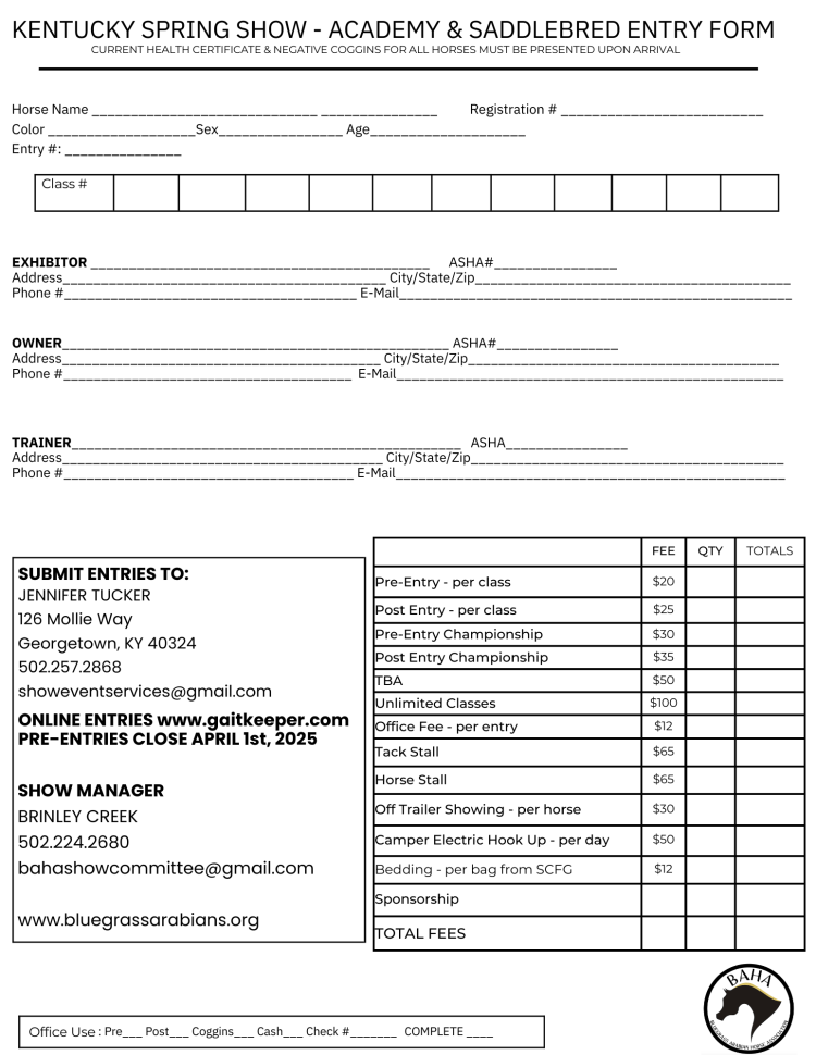 SHOW MANAGER: Brinley Creek 502.224.2680 bahashowcommittee@gmail.com